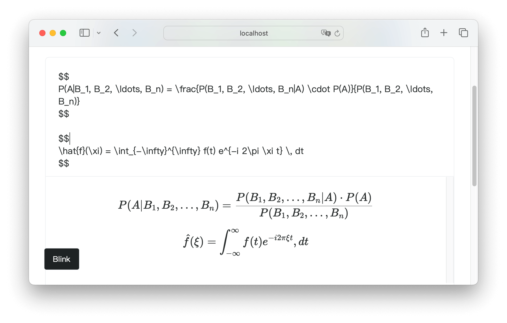 对于学术网站来说,支持 LaTeX 是一个刚需,可以使用 Katex 这款被前端广泛使用的 LaTeX 语法解析器来继承该功能。Artalk 为保持简洁,并未内置 LaTeX 语法解析功能,你可以手动在页面中引入 Katex 和 Artalk Katex 插件,让评论系统获得 LaTeX 语法支持。